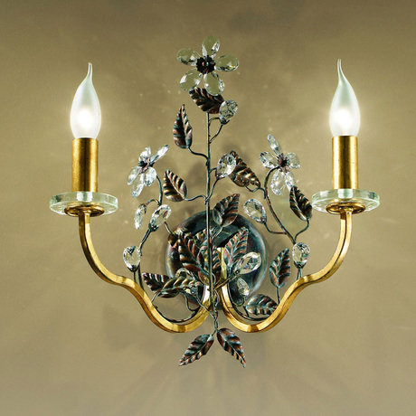 Бра 2-х рожковое выполнено из кованного металла. Декор: прозрачные стеклянные чашечки и камни в виде лепестков цветов. Цвет арматуры: мультиколор с золотом. Дизайн: Enrico de Girardi. По индивидуальному заказу возможны различные модификации и варианты отделки.